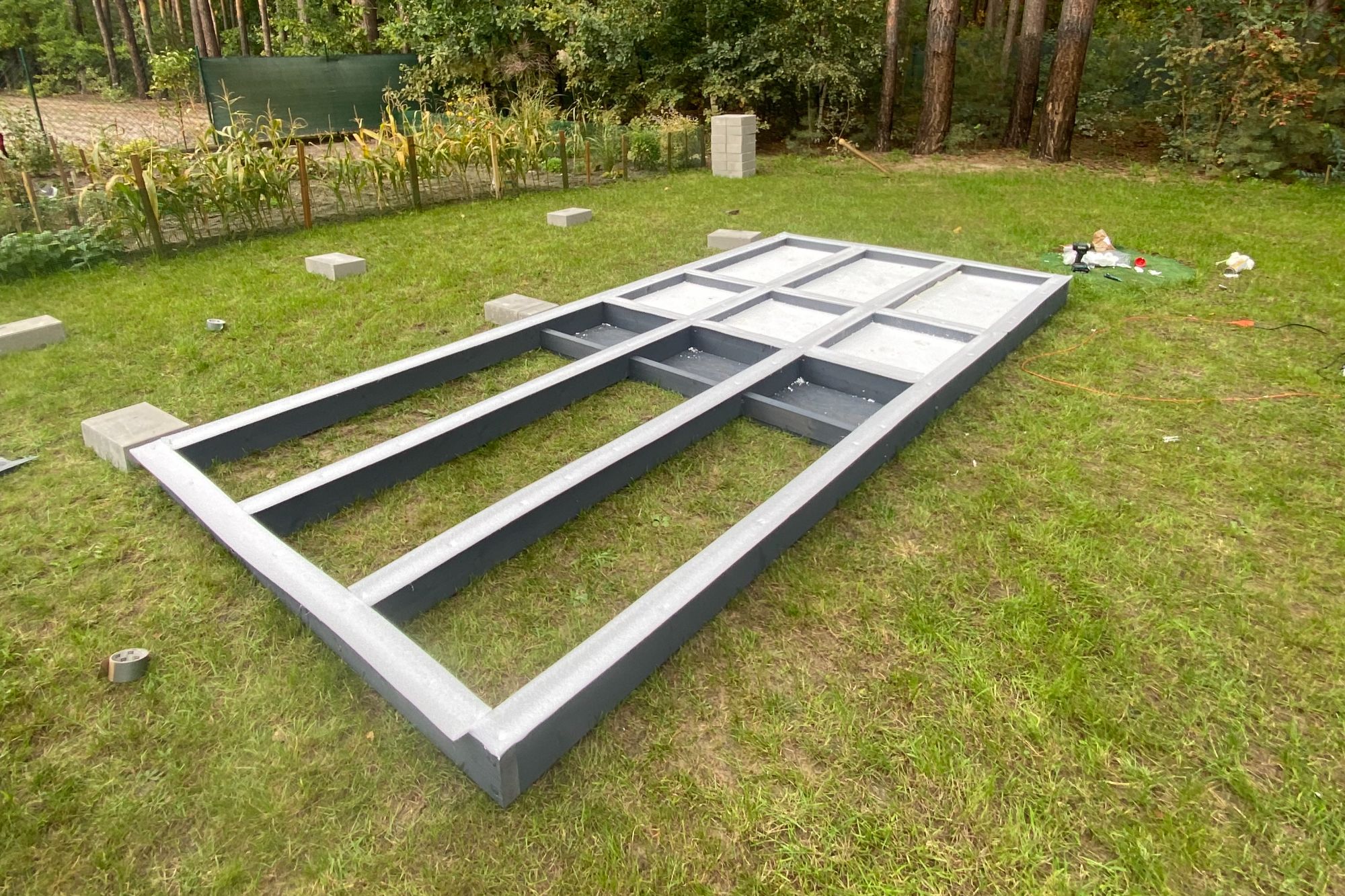 Na początku Filip zrobił podstawę budynku. Użył do tego drewna konstrukcyjnego C24 (14,5 cm x 4,5 cm). Od spodu przymocował styropian i taśmę dylatacyjną, żeby odizolować drewno od bloczków betonowych.